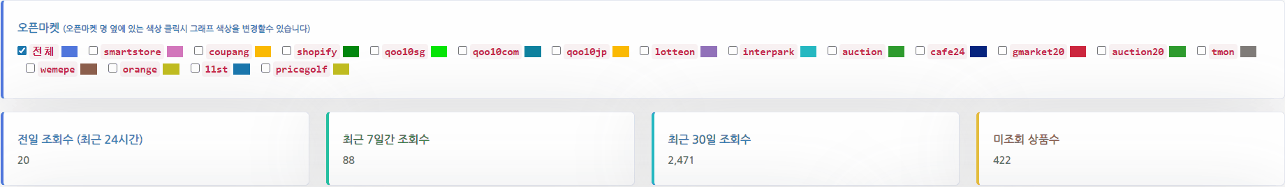 - - 오픈마켓 명 오른쪽의 색상 박스를 클릭하면 해당 오픈마켓의 [누적 조회수 그래프]의 색을 변경할 수 있습니다.