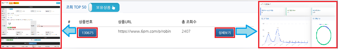 - - 총 조회수 많은 순으로 정렬되어있으며[상세보기]를 클릭해서 상품 1개의 일간/주간/월간 조회수를 확인할 수 있습니다.