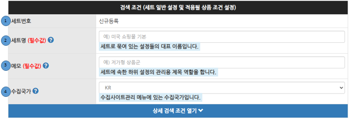 - ② 세트명 : 가격정책 결정하는 곳(설정/대량수집 메뉴 등)에 노출되는 이름으로 관리하기 편하게 설정해 주시면 됩니다.