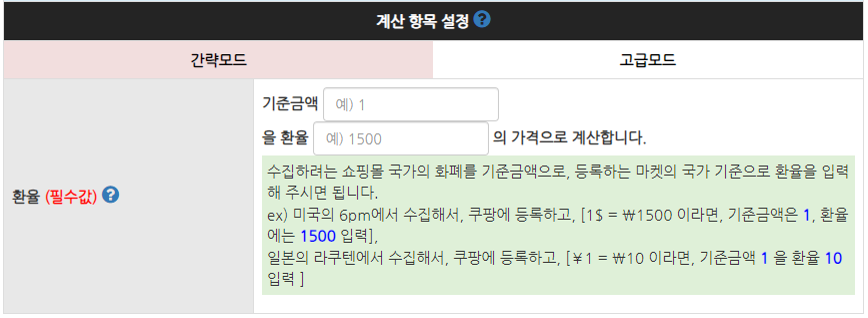 - - 환율 : 수집된 상품의 화폐 기준으로 노출되기를 원하는 가격의 환율을 입력해 주시면 됩니다.