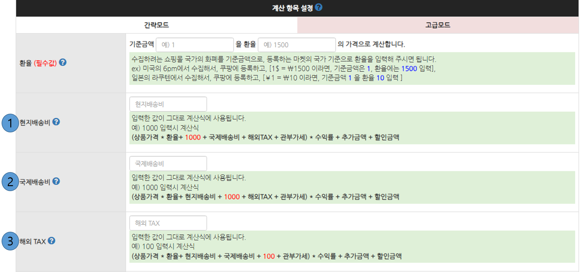 - - 고급모드에서는 [기본 계산식], 또는 [가격계산식 별도 셋팅]에서 사용된 항목들을 입력하게 됩니다.