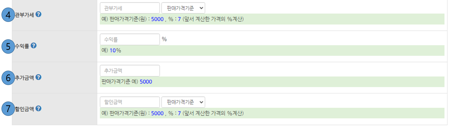 - ⑤ 수익률 ( % ) : 상품가에 추가할 수익률을 입력해 주시면 됩니다.