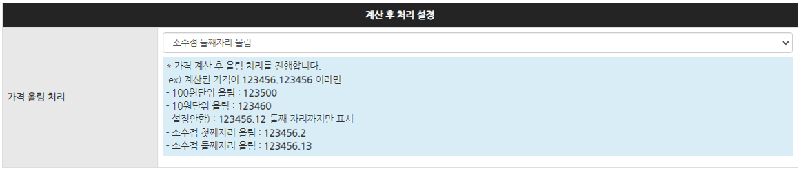 - - 상품가격이 결정된 뒤 후처리를 진행할 수 있습니다. 100자리, 10자리, 소수점 첫째, 소수점 둘째 자리에서 올림 처리를 할 수 있으며, 설정 안 함 처리로 계산식 그대로 노출도 가능합니다.