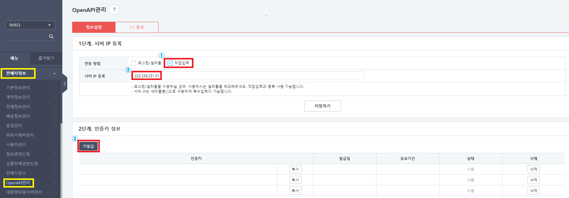 - - ① 정보설정에서 연동방법을 √직접입력으로 체크해 주시고