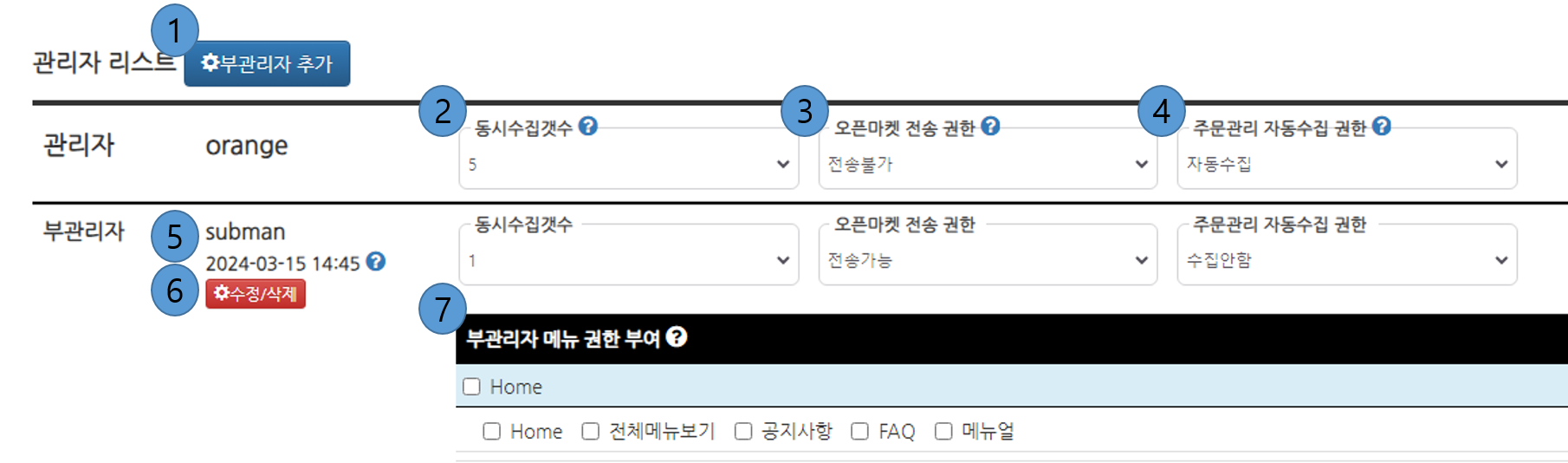 - ⑦ 부관리자 메뉴 권한 부여 : 부관리자로 접근 가능한 메뉴를 선택합니다.