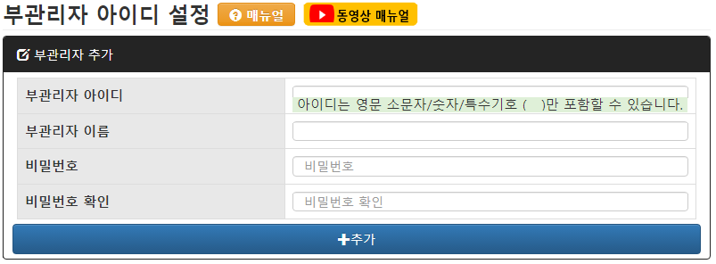 - - 부관리자 아이디로는 [영문소문자, 숫자, 특수기호중 언더바(under bar, _ )]만 사용 가능합니다.