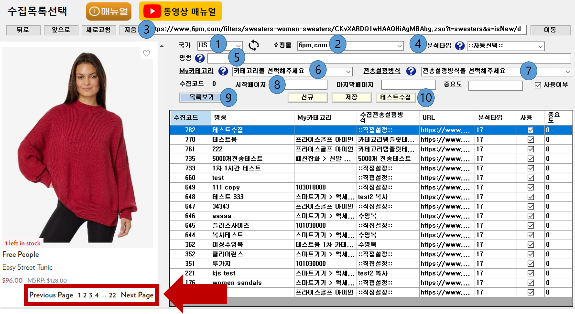 - - 수집하는 쇼핑몰의 URL에 알맞는 페이지 정보가 포함되어있다면 해당 부분은 {page_num}으로 치환되며, 수집시에 이부분이 변경되어 자동 페이지 넘김으로 동작합니다.