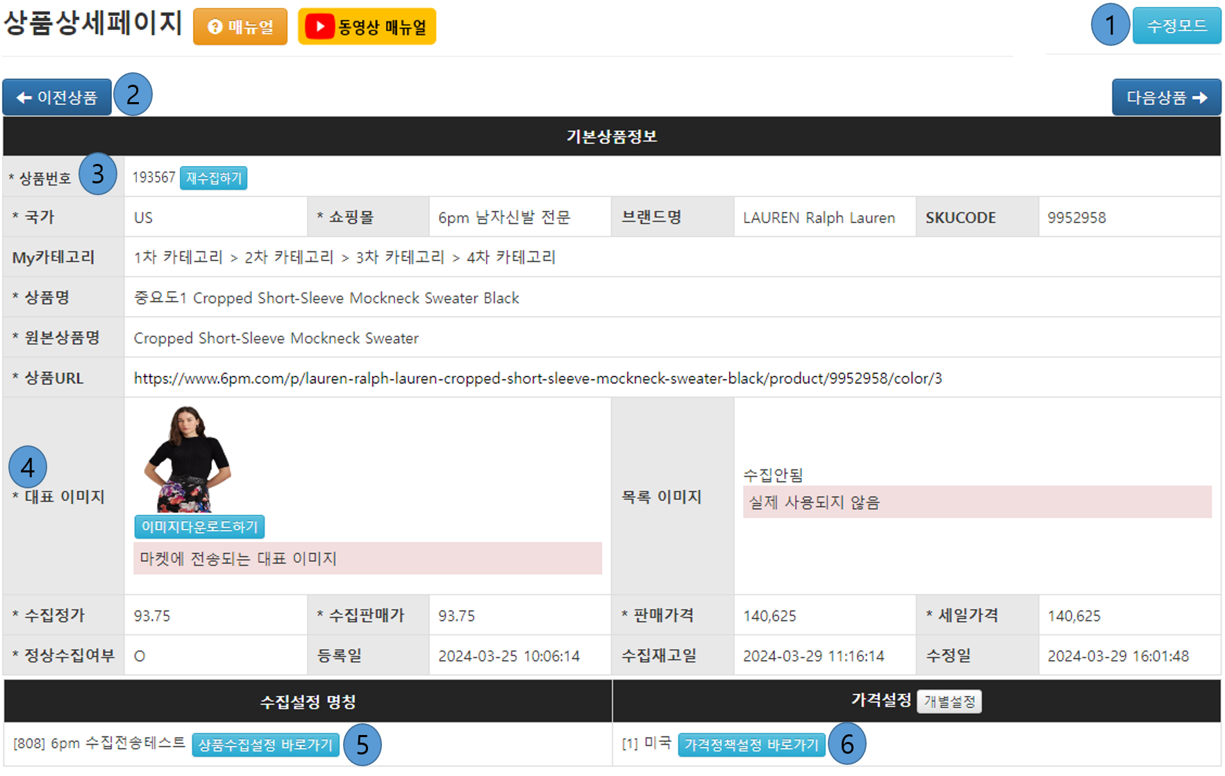 - ① 수정모드 : 상품정보를 직접 수정할 수 있는 [상품상세페이지 수정모드]로 이동합니다.