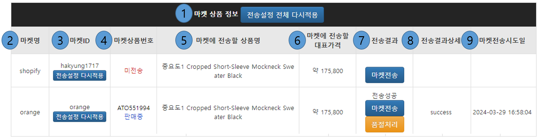 - ④ 마켓상품번호 : 마켓으로의 전송상태를 나타내며, 전송되었을 경우 그 마켓으로의 상품 링크를 제공합니다.