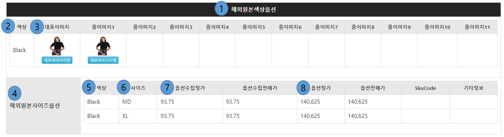 - ④ 해외원본사이즈 옵션 : 색상별로 수집된 사이즈 옵션을 보여줍니다.