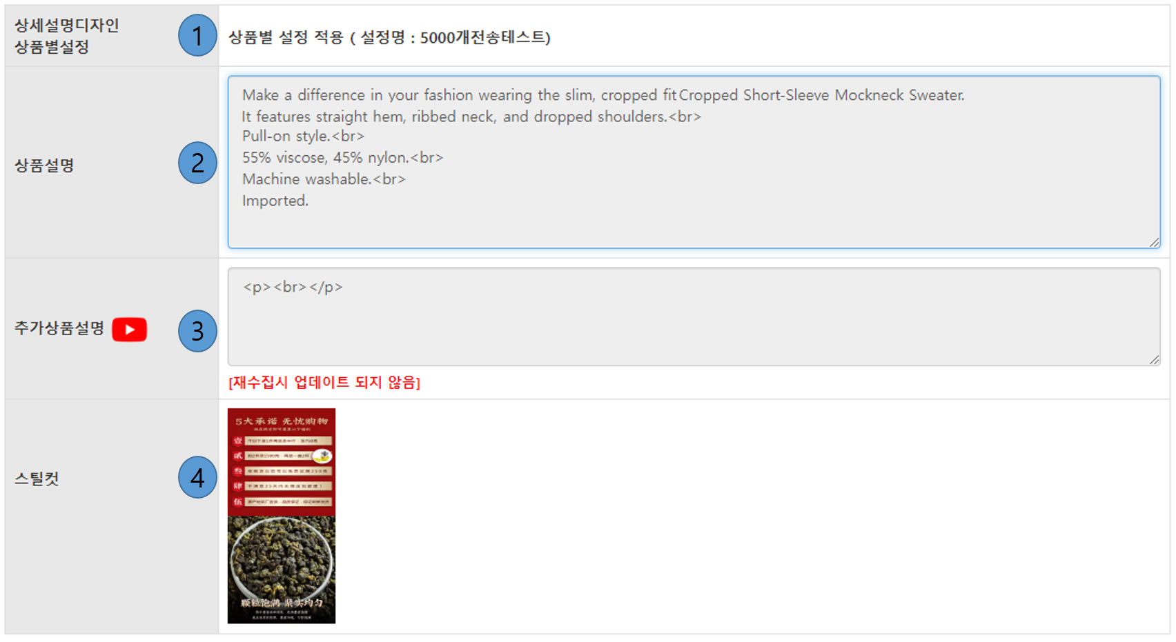 - ③ 추가상품설명 : 사용자가 직접 입력하는 내용으로 입력시 재고수집해도 변경되지 않는 내용입니다.