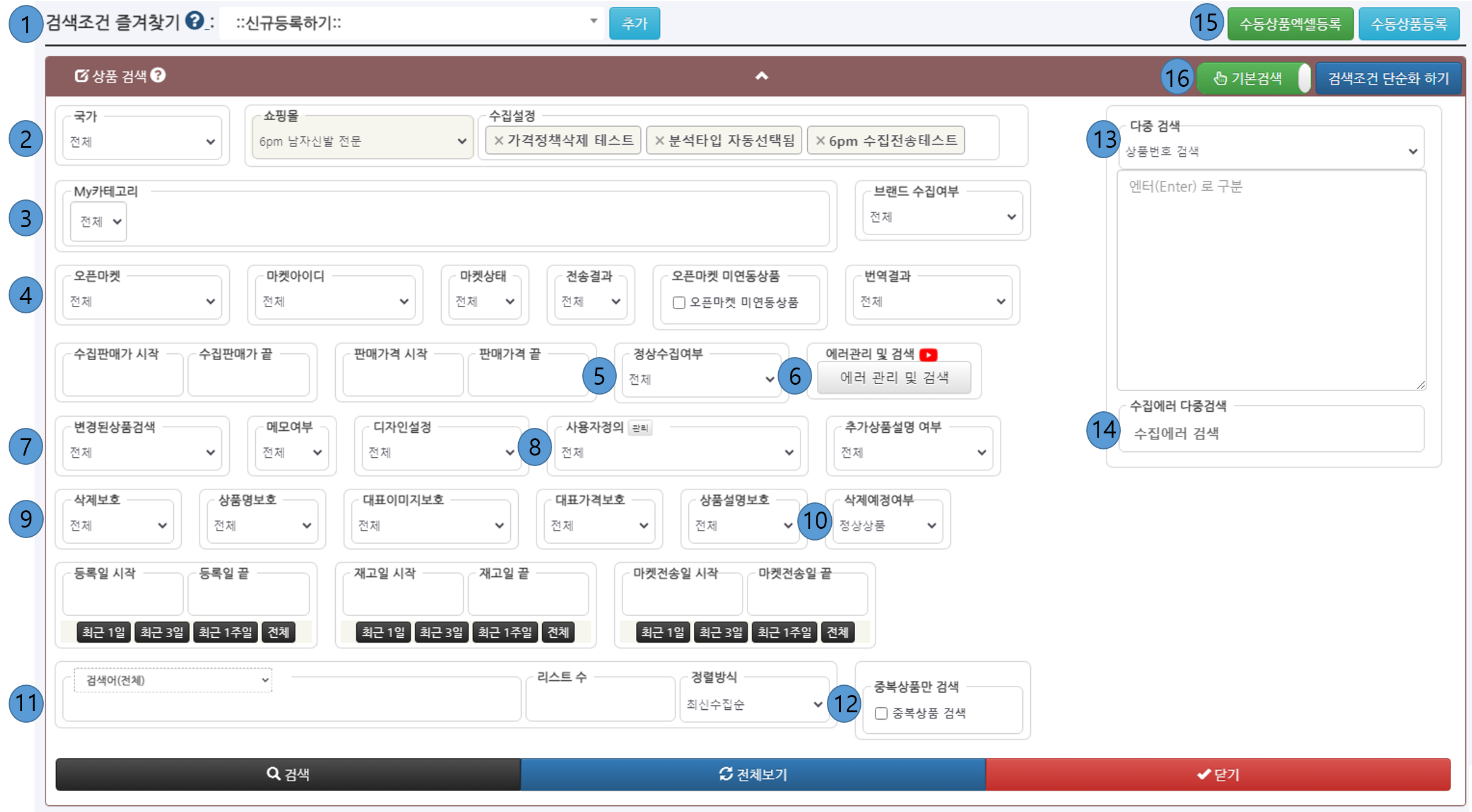 - ⑭ 수집에러 다중검색 : 상품 수집시 발생한 에러별로 검색하는 기능입니다.