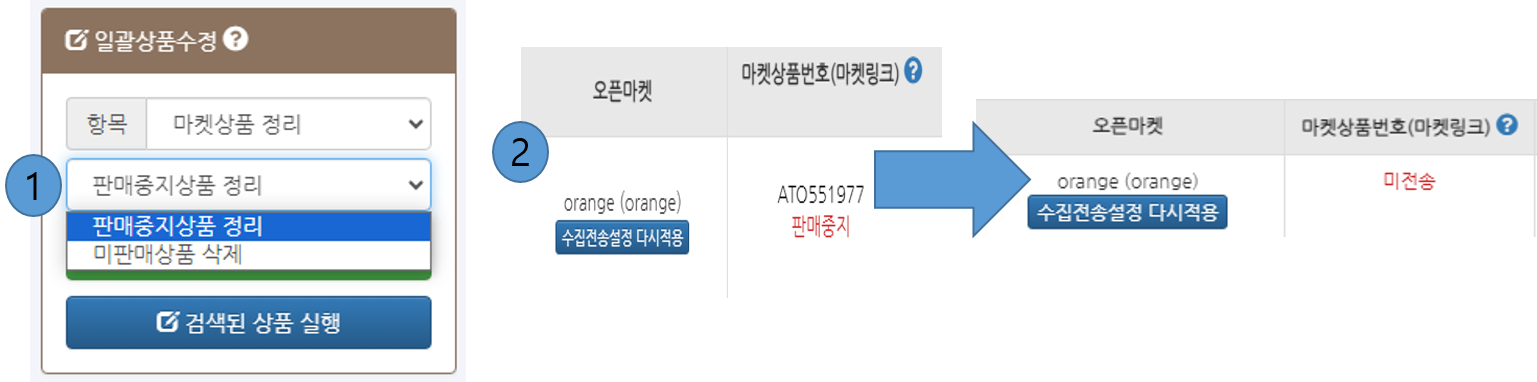 - ② [판매중지상품 정리]할 경우 해당 오픈마켓으로의 마켓링크는 삭제되고 전송상태는 미전송 상태로 변경됩니다.