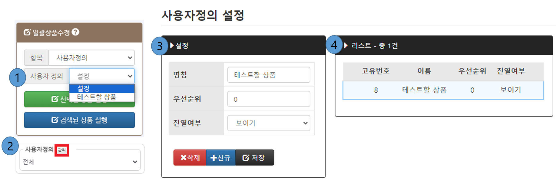 - ③ 설정의 내용을 통해 [일괄상품수정]의 [사용자 정의] 부분에 노출될 사용자 정의 리스트의 순서와 노출여부를 결정합니다.