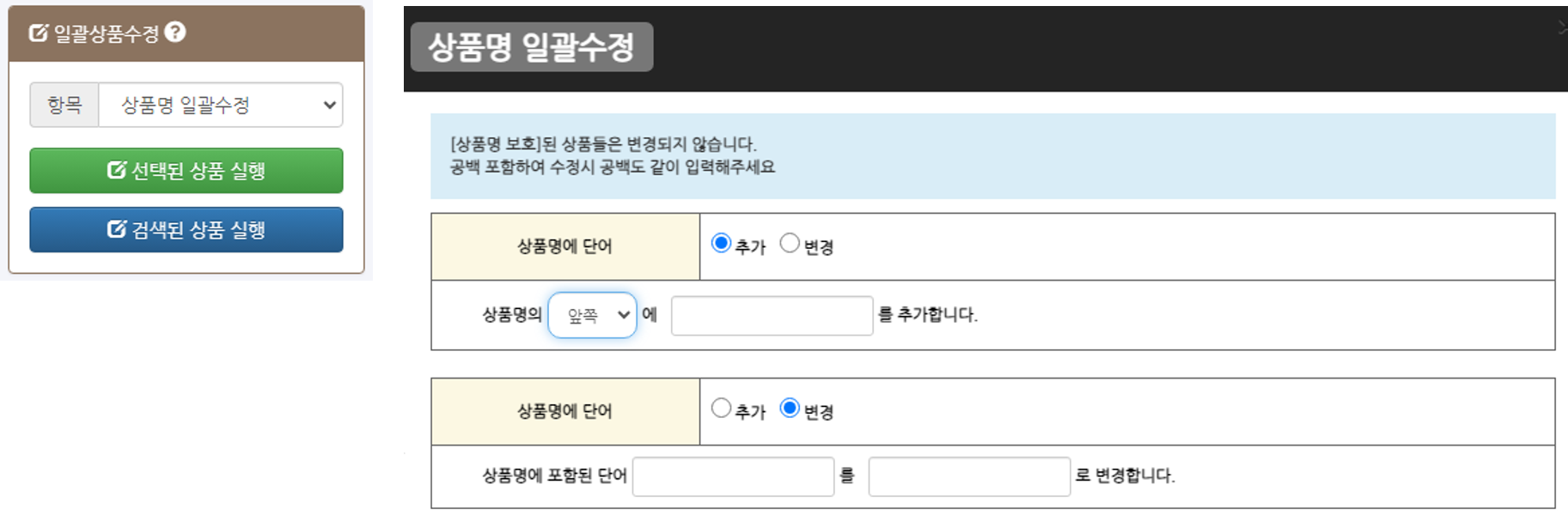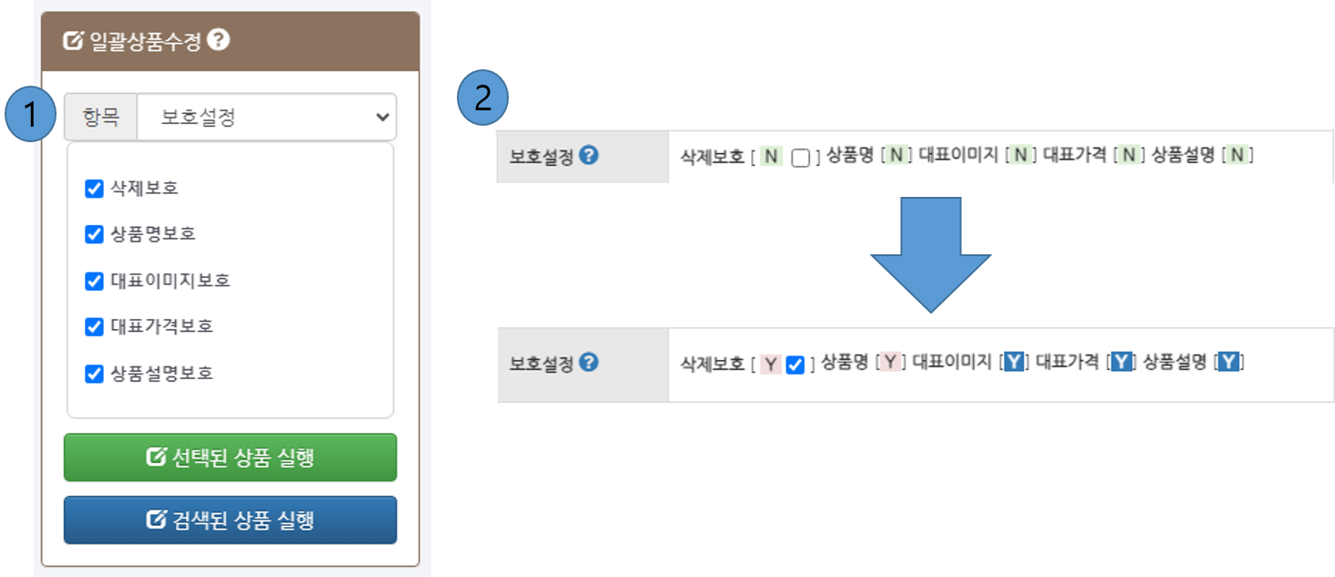 - - 상품명 보호처리가 되어있는 상품은 일괄변경을 통해서 수정은 가능하지 않습니다.