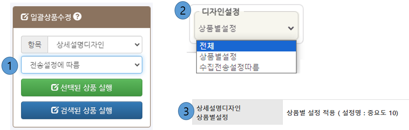 일괄상품수정 메뉴에서 각 상품별로 별도 지정도 가능합니다. - ① 상세설명디자인 셀렉트 박스 : [지원센터 > 전체메뉴보기 > 상세설명디자인]에서 생성한 상세설명디자인 템플릿들을 선택할 수 있습니다.