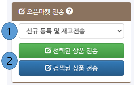 - ② 선택된(검색된) 상품 전송 : 선택하거나 검색된 상품들로 전송 작업을 시작해서 오픈마켓 전송하기창을 띄웁니다.