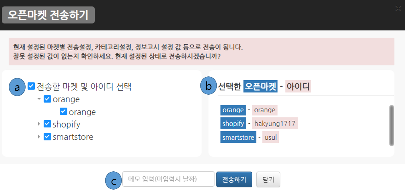 - * 오픈마켓 전송하기 : 어떤 오픈마켓에 어떠한 아이디로 전송할 지 선택하는 창입니다.