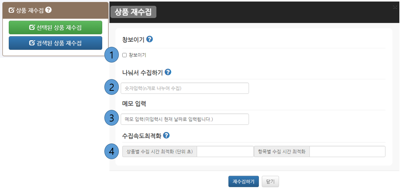 - ⑤ 재수집하기 : 선택한 상품을 즉시 재수집 합니다. 수집시에 [창보이기]를 할 것인지 선택할 수 있습니다.