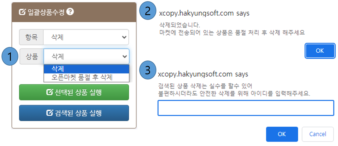 - - 삭제보호된 상품, 오픈마켓에 판매중인 상품은 위 알림 창에서 아이디를 입력하더라도 삭제 되지 않습니다.