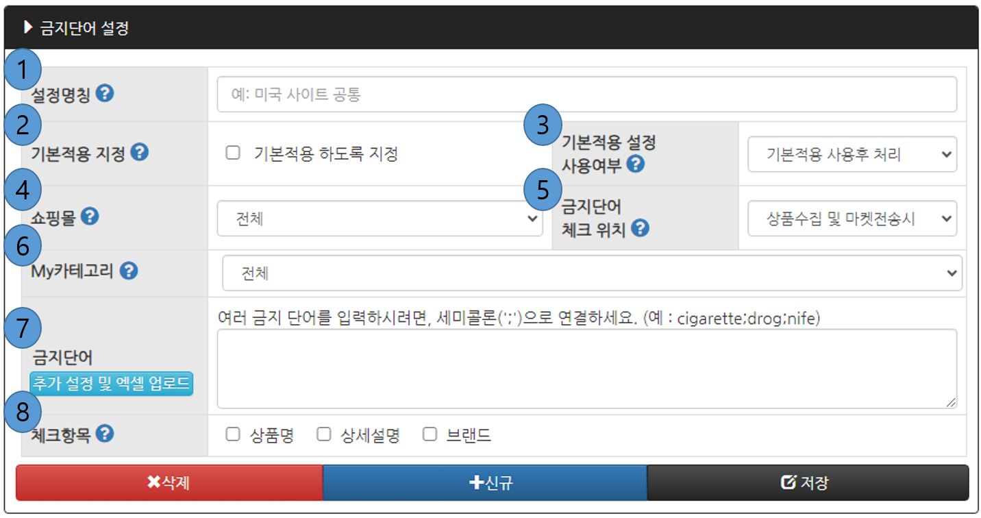 - ⑧ 체크항목 : 상품명, 상세설명, 브랜드명 중에서 금지단어를 체크해야할 항목을 지정합니다. 여러개를 선택 하실 수 있습니다.