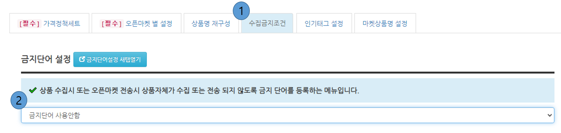 상품 수집 시 또는 오픈마켓전송시 수집/전송 되지 않도록 금지 단어를 설정할 수 있는 메뉴입니다.