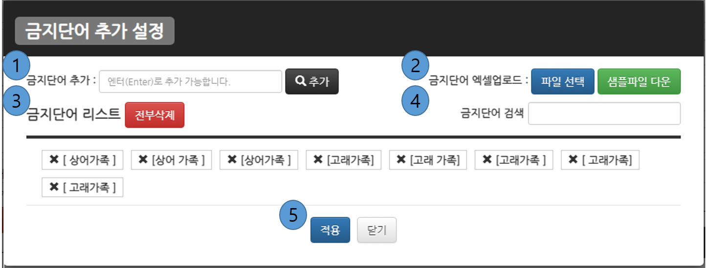 - ⑤ 적용 : 여기서 적용을 클릭해 주시면 앞의 [금지단어 설정]메뉴의 "금지단어"부분에 입력이 되며 그곳에서 [저장]을 클릭해 주셔야 실제 저장이 됩니다.