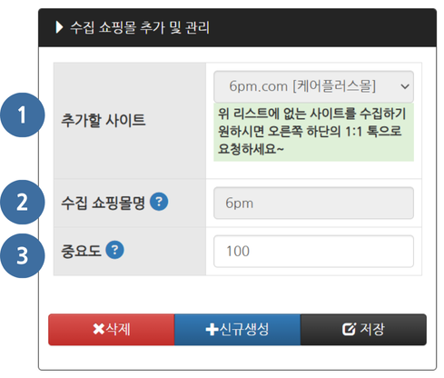 - - 추가할 사이트의 쇼핑몰명을 관리하기 쉬운 이름으로 설정할 수 있습니다.