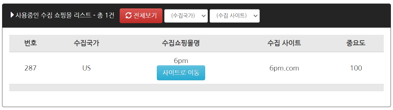 - - 쇼핑몰 관리 항목에서는 국가, 쇼핑몰명, 수집 사이트, 중요도, 진열 여부 등의 정보를 확인할 수 있습니다.