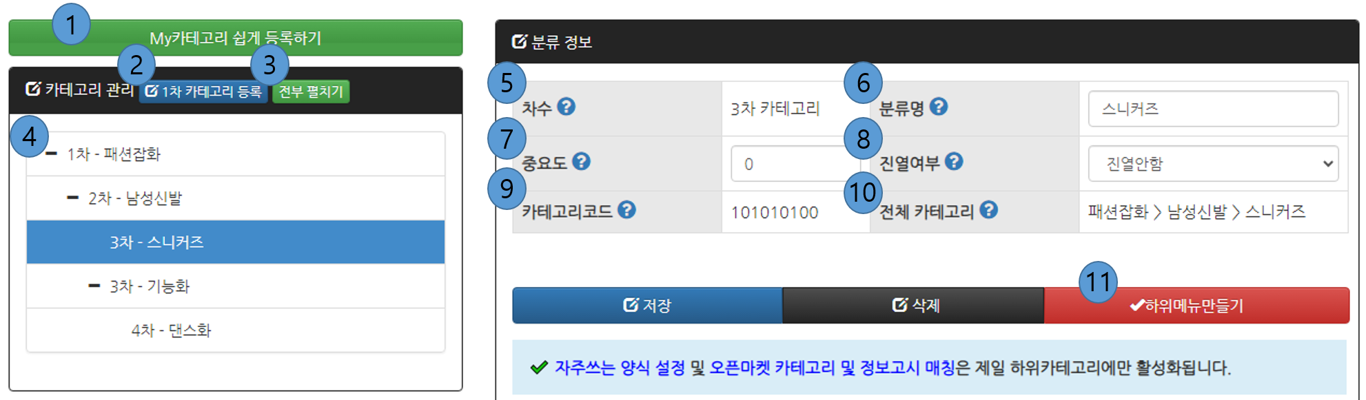 - ⑪ 하위메뉴만들기 : 현재 카테고리 하위에 새로운 카테고리를 생성합니다.