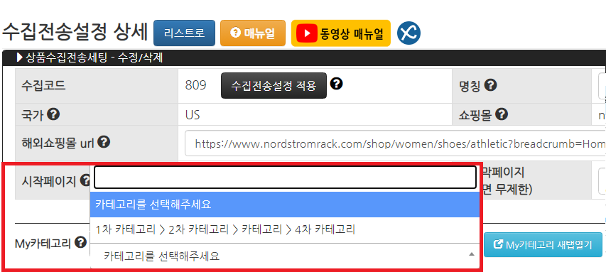 - - [전송하기 > 상품리스트]에서 보여지는 카테고리나, [수집하기 > 설정/대량수집 > 수집전송설정 상세]에서 보여지는 카테고리는 모두 전체 카테고리입니다.