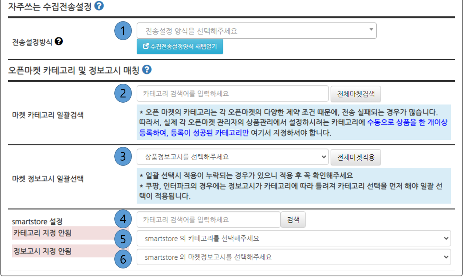 - ② 마켓 카테고리 일괄검색 : 설정할 수 있는 마켓에 대해서 한번에 카테고리를 검색합니다.