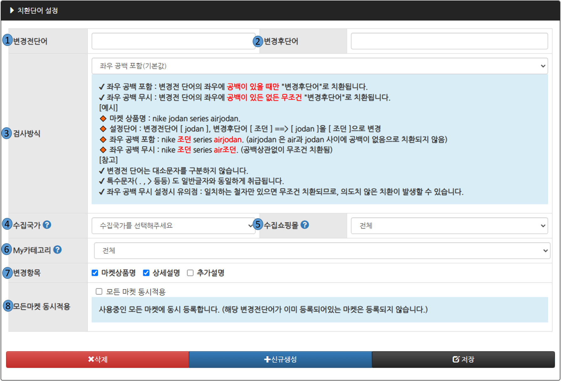 - - 어디에 있는 단어를 치환할 것인지 선택할 수 있습니다. [마켓상품명], [상세설명], [추가설명]중에서 선택할 수 있으며, 여러개를 선택할 수도 있습니다.