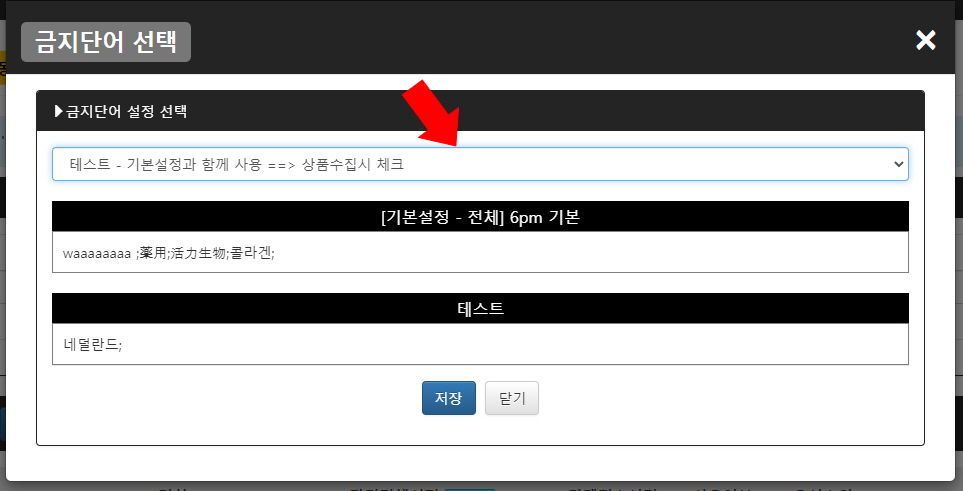- * 금지단어: [설정하기]버튼으로 [수집하기 > 설정/대량수집 > (탭)금지단어설정] 메뉴에서 설정한 금지단어의 명칭을 선택해 주시면 됩니다.