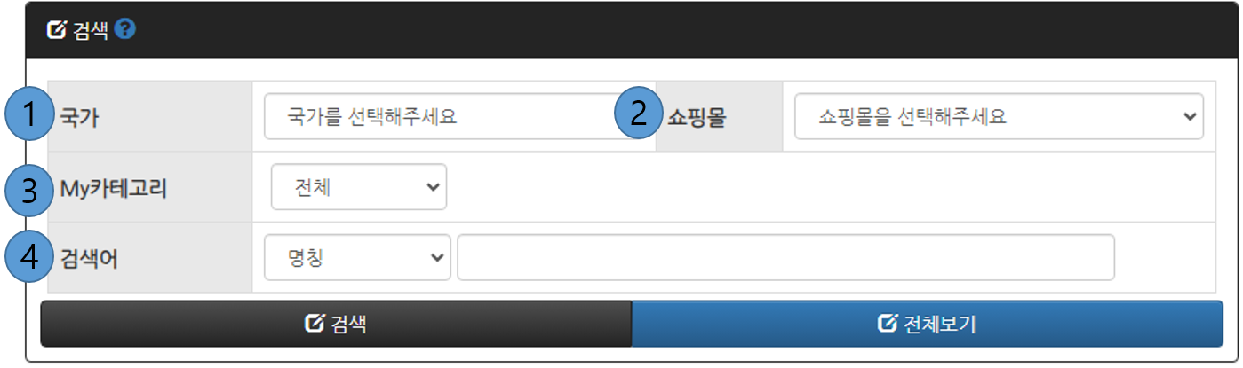 - - 특정 국가나 쇼핑몰의 전체 리스트를 조회 하시려면 명칭이나 쇼핑몰을 공란으로 두고 검색하실 수 있습니다.