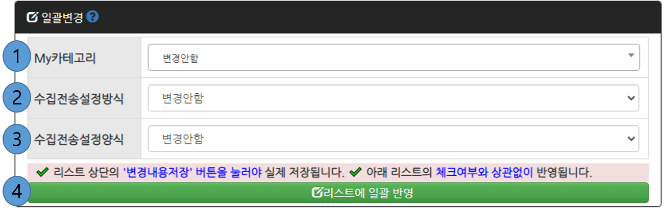 - * 일괄변경 : [수집전송설정 리스트]의 내용을 일괄적으로 수정할 수 있습니다.