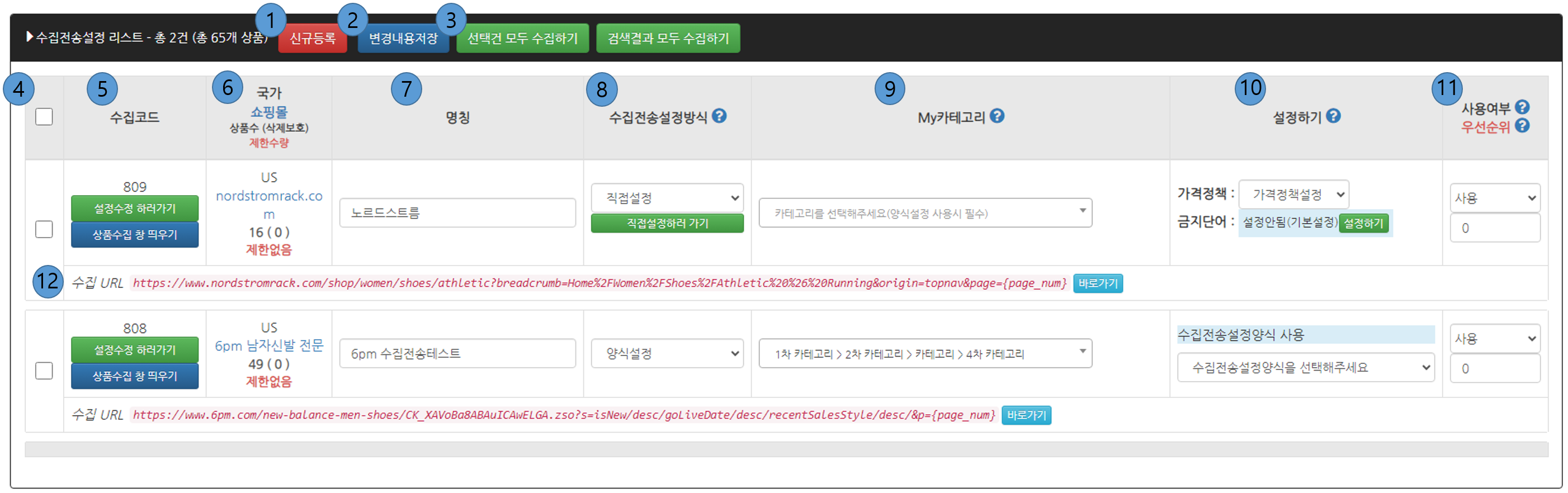 - ⑫ 수집 URL : [수집하기 > 수집목록선택] 메뉴나 [수집하기 > 설정/대량수집 > 신규등록]에서 입력해 주신 해외쇼핑몰 URL부분, [수집쇼핑몰의 리스트 페이지 URL]이 노출되는 부분입니다.