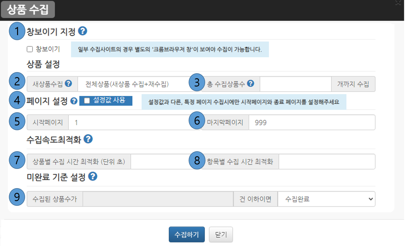 - ③ 총 수집상품수 : 수집상품수가 총 수집상품수에 지정된 숫자에 도달하면 수집을 종료합니다.