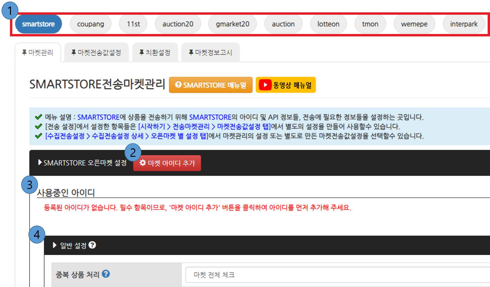 - - 해당 마켓에 적용할 중복 상품 처리 설정 등의 [일반 설정]을 관리할 수 있습니다.