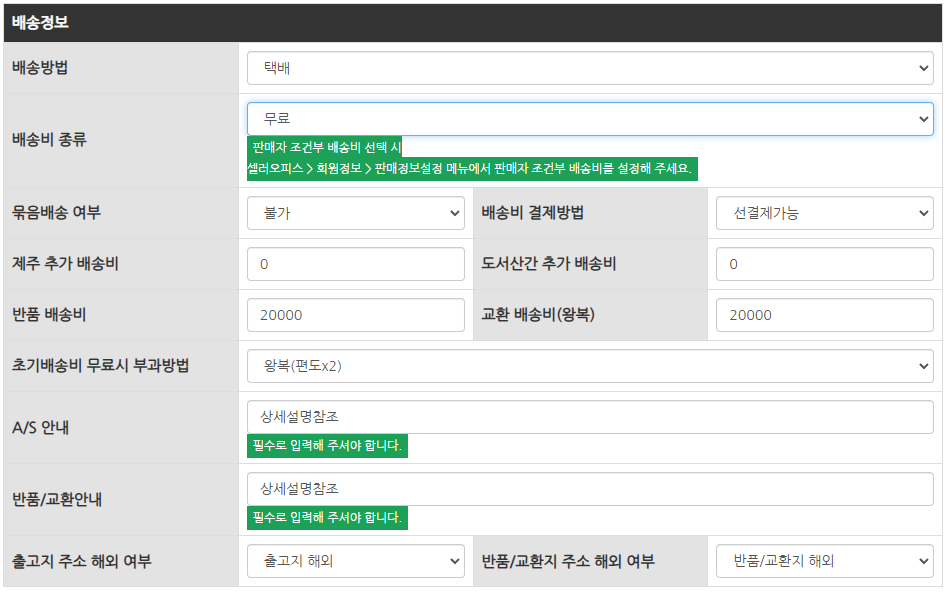 - - 교환/반품시 교환/반품지가 해외인지 국내 인지 설정합니다.