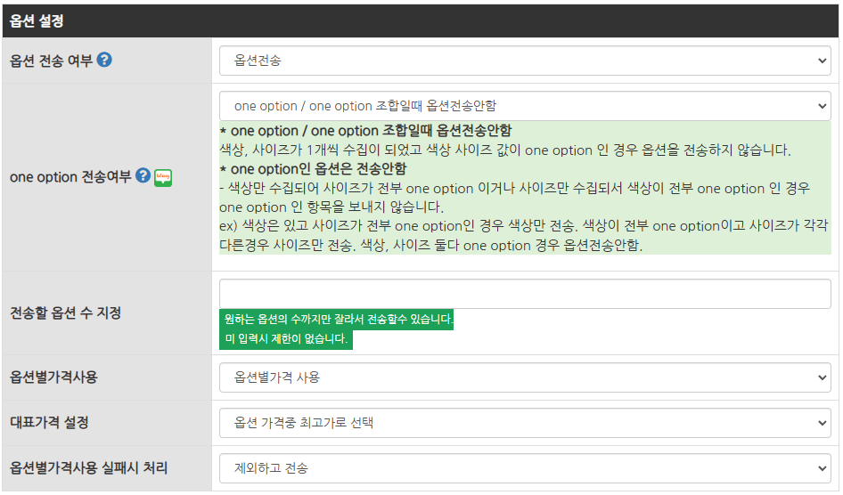 - - [옵션전송] 설정후 다시 [옵션전송안함] 사용시 상품 품절 후 다시 신규로 전송해야합니다.