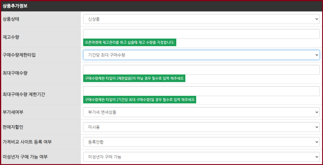 - - [구매수량제한없음] 외에 다른 설정시 [최대구매수량]은 필수입니다.