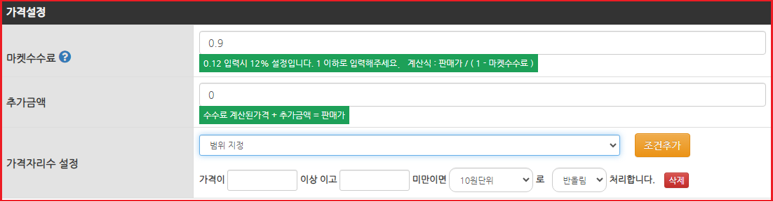 - - 마켓수수료까지 계산된 가격에서 해당 마켓에서만 추가적으로 받기 원하시는 금액을 입력해 주시면 됩니다.