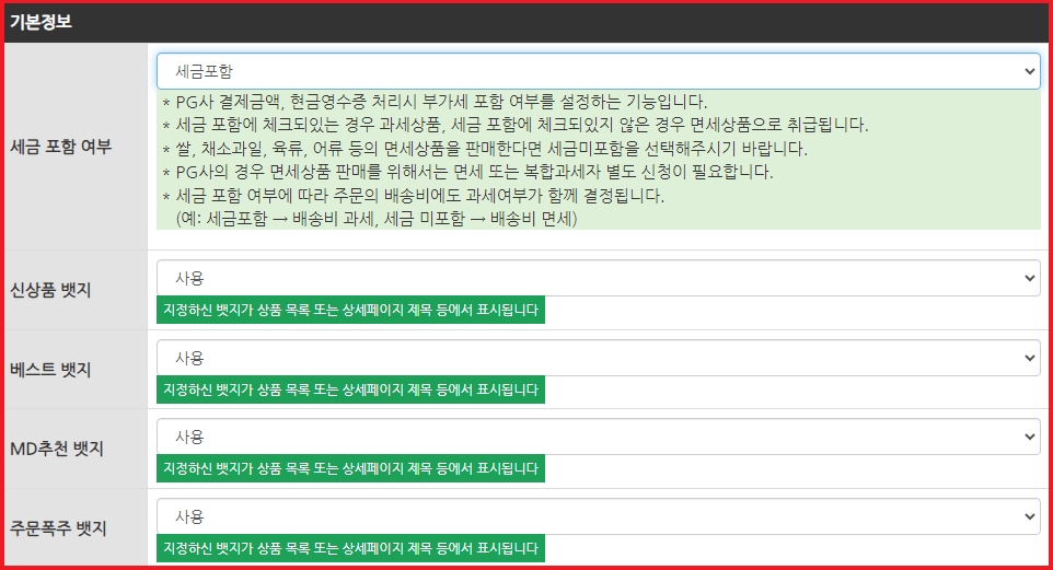 - 뱃지 - 선택한 뱃지가 상품목록과 상세페이지등에 표시됩니다.