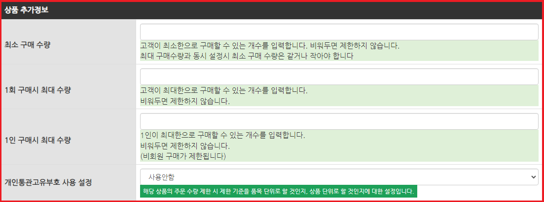 - 1인 구매시 최대 수량 - 1인이 최대한으로 구매할 수 있는 개수를 입력합니다. 비워두면 제한하지 않습니다. (비회원 구매가 제한됩니다)