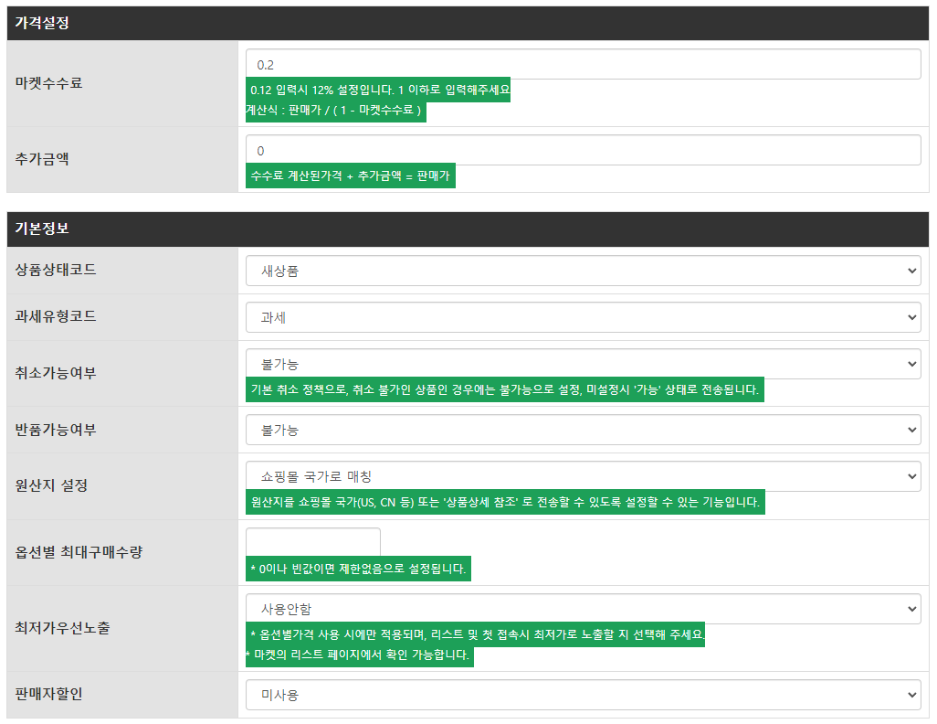 - - 마켓에 전송할 상품의 수수료를 설정하는 항목입니다. 카테고리별로 수수료율이 다를 수 있어서 알맞게 설정하시면 됩니다.