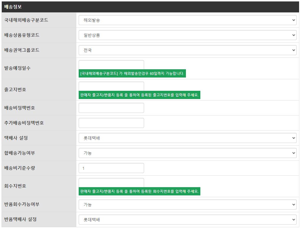 - - 상품의 발송예정일을 입력합니다. 국내해외배송구분코드에서 해외발송으로 선택하셨을 경우 최대 60일까지 설정이 가능합니다.