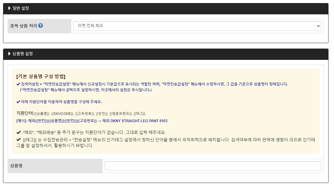 - - 동일한 상품명을 기준으로 중복 상품의 전송 여부를 설정하는 기능입니다.
