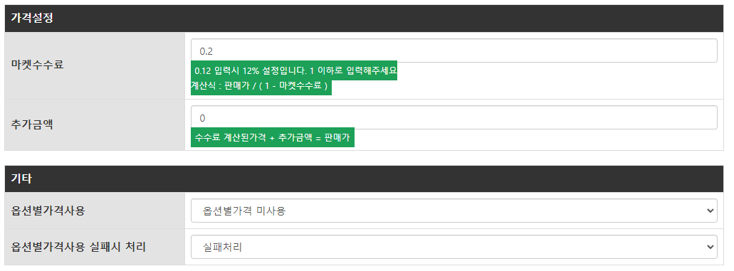 - - 마켓에 전송할 상품의 수수료를 설정하는 항목입니다. 카테고리별로 수수료율이 다를 수 있어서 알맞게 설정하시면 됩니다.