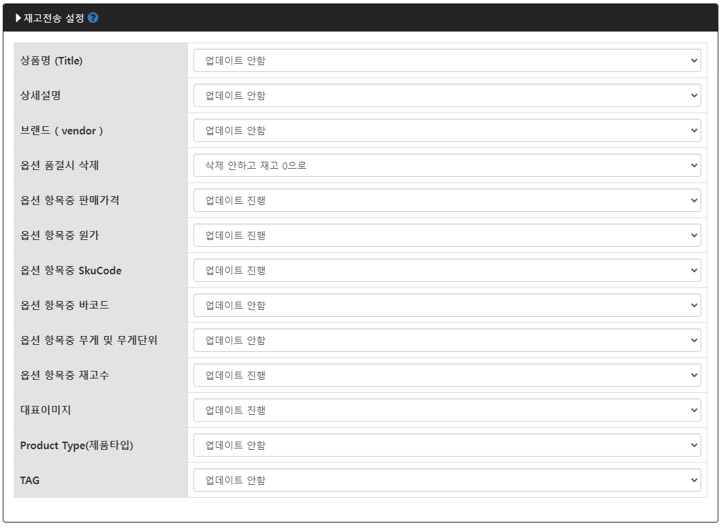 - - 신규 등록 후 수동으로 shopify 관리자화면 에서 수정을 하셨다면 해당 항목을 [업데이트 안함] 으로 전송하면 수정한 항목 유지됩니다.